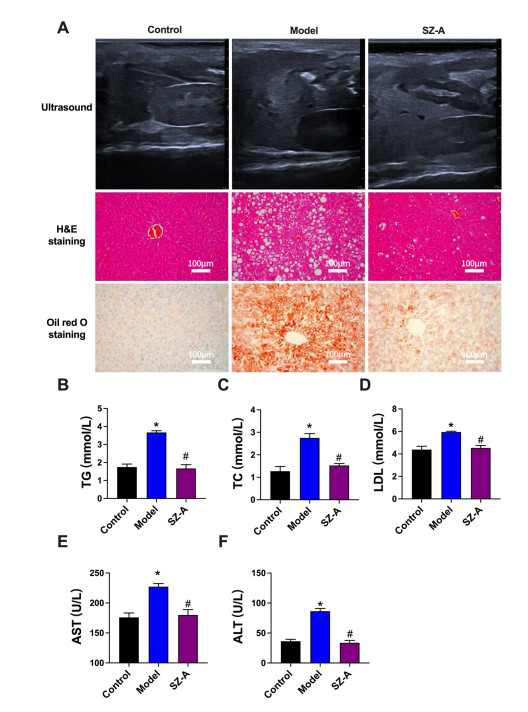 Background and objective Both type 2 diabetes mellitus (T2DM) and metabolic dysfunction-associated steatotic liver disease (MASLD) are known to be influenced by environmental and lifestyle factors. Ramulus Mori (Sangzhi) alkaloids (SZ-A) are effective hypoglycemic agents. Recent studies suggest that SZ-A may improve T2DM, MASLD, and metabolic syndrome, but the underlying mechanisms remain unclear. This study aimed to investigate whether SZ-A can modulate hepatic lipid metabolism and gut microbiota in a mouse model of T2DM combined with MASLD. Methods A combined T2DM-MASLD mouse model was established using a high-fat diet and streptozotocin injection. Liver morphology and histology were assessed using a portable small-animal ultrasound imaging system, hematoxylin and eosin (H&E) staining, and Oil Red O staining. Serum levels of triglycerides (TG), total cholesterol (TC), low-density lipoprotein (LDL), alanine aminotransferase (ALT), and aspartate aminotransferase (AST) were measured using standard assay kits. Gut microbiota composition was analyzed by 16S rRNA sequencing, and hepatic lipid metabolites were profiled using liquid chromatographymass spectrometry (LC-MS)MS. Results SZ-A improved liver function by ameliorating morphological and structural abnormalities, reducing lipid droplet accumulation, and lowering serum levels of TG, TC, LDL, ALT, and AST. It also led to decreased hepatic ultrasound echo intensity compared to the kidney. Additionally, SZ-A helped restore gut microbiota balance, including a partial reversal of the Firmicutes/Bacteroidetes ratio. Lipidomic analysis revealed that SZ-A downregulated most TG and diglycerides (DG), while upregulating phosphatidylcholine (PC) and phosphatidylethanolamine (PE) in the model group. Conclusions SZ-A partially alleviates liver injury in T2DM-MASLD mice by modulating hepatic lipid metabolism and gut microbiota composition.