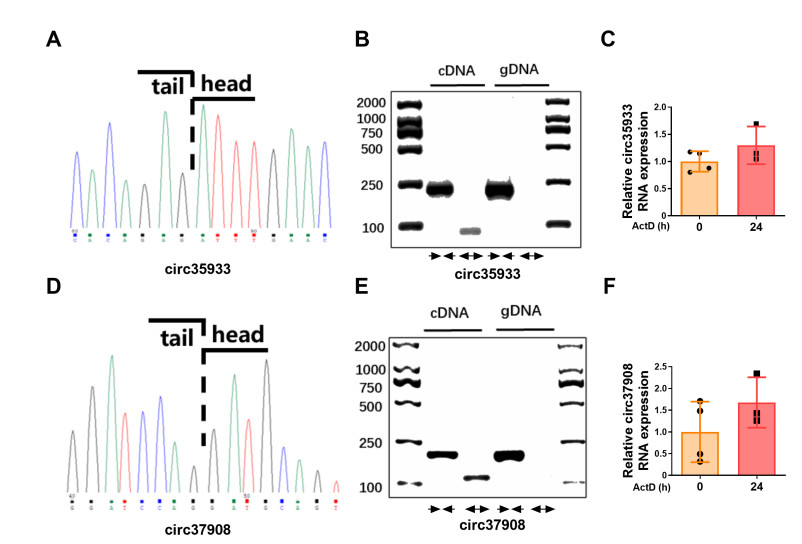 (A, D) Identification of circRNA back-splice junctions by Sanger sequencing. (B, E) Validation of circular structures using divergent and convergent primers with cDNA and genomic DNA templates. (C, F) CircRNA stability assessed by actinomycin D treatment. N = 3-4.