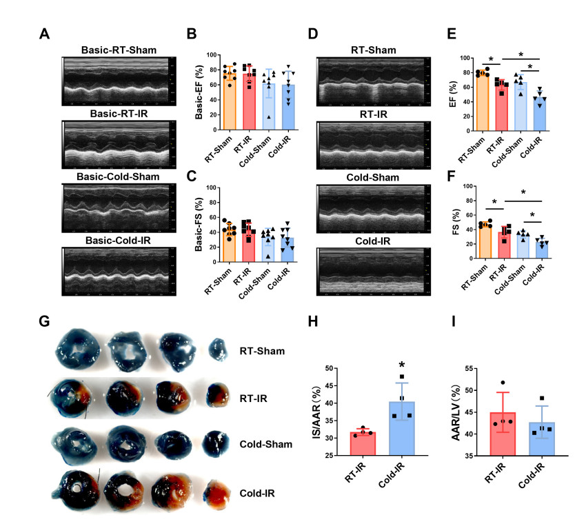 (A) Baseline echocardiographic assessment of cardiac function. (B) Ejection fraction (EF%). (C) FS%. N = 8. (D) Echocardiographic assessment after four weeks of cold exposure. (E) EF%. (F) FS%. *P < 0.05, **P < 0.01 versus Sham, N = 5. (G-I) Representative images and quantitative analysis of myocardial injury assessed by Evans blue-TTC double staining. *P < 0.05 versus RT-I/R, N = 4.