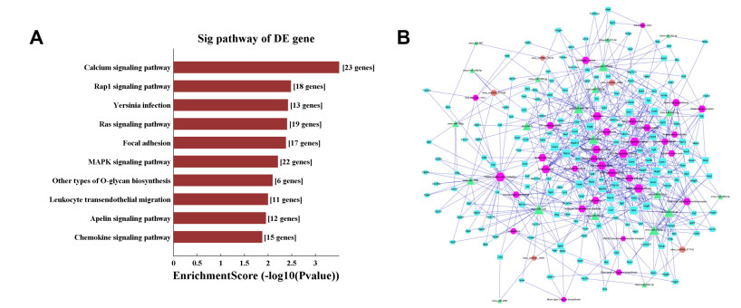 (A) Kyoto Encyclopedia of Genes and Genomes (KEGG) pathway enrichment analysis of cold-responsive circRNAs. (B) ceRNA network of five cold-responsive circRNAs and their sponge miRNAs under cold stress conditions. CircRNAs are shown as orange nodes, miRNAs as green nodes, and downstream target genes as blue nodes.